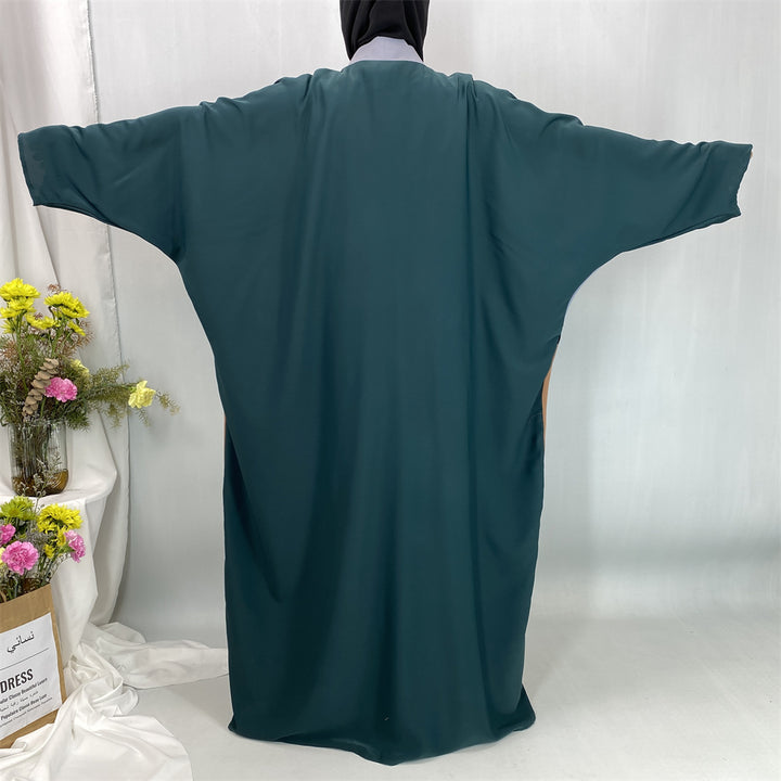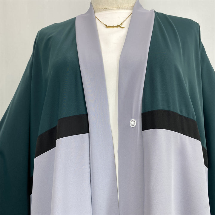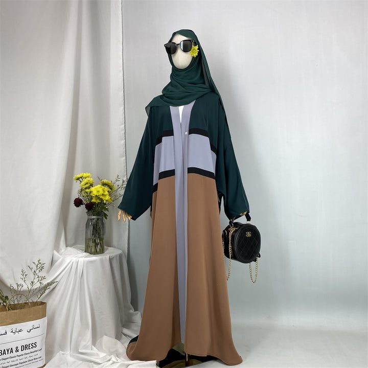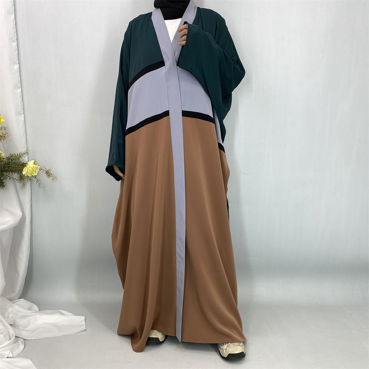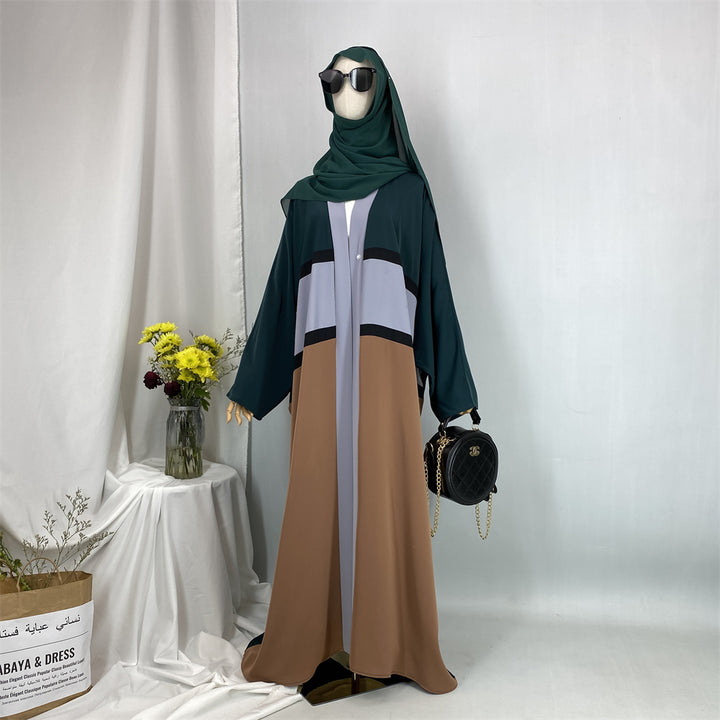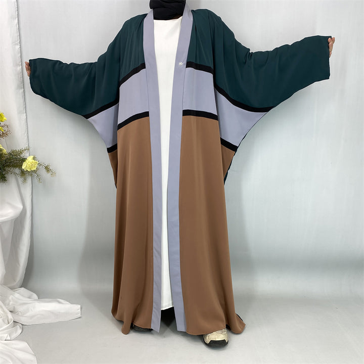 1459# 2025 Latest Muslim Open Abaya Robe Dubai Islamic Wholesale Bat Sleeve Patchwork Color Nida With Button for Women Ramadan