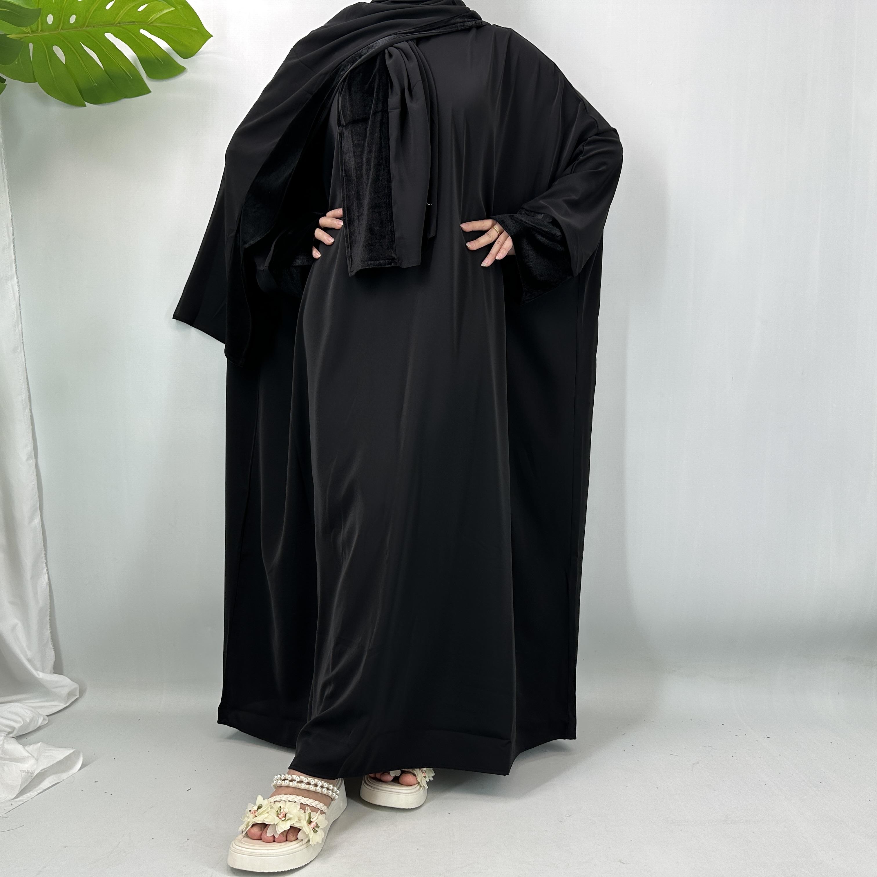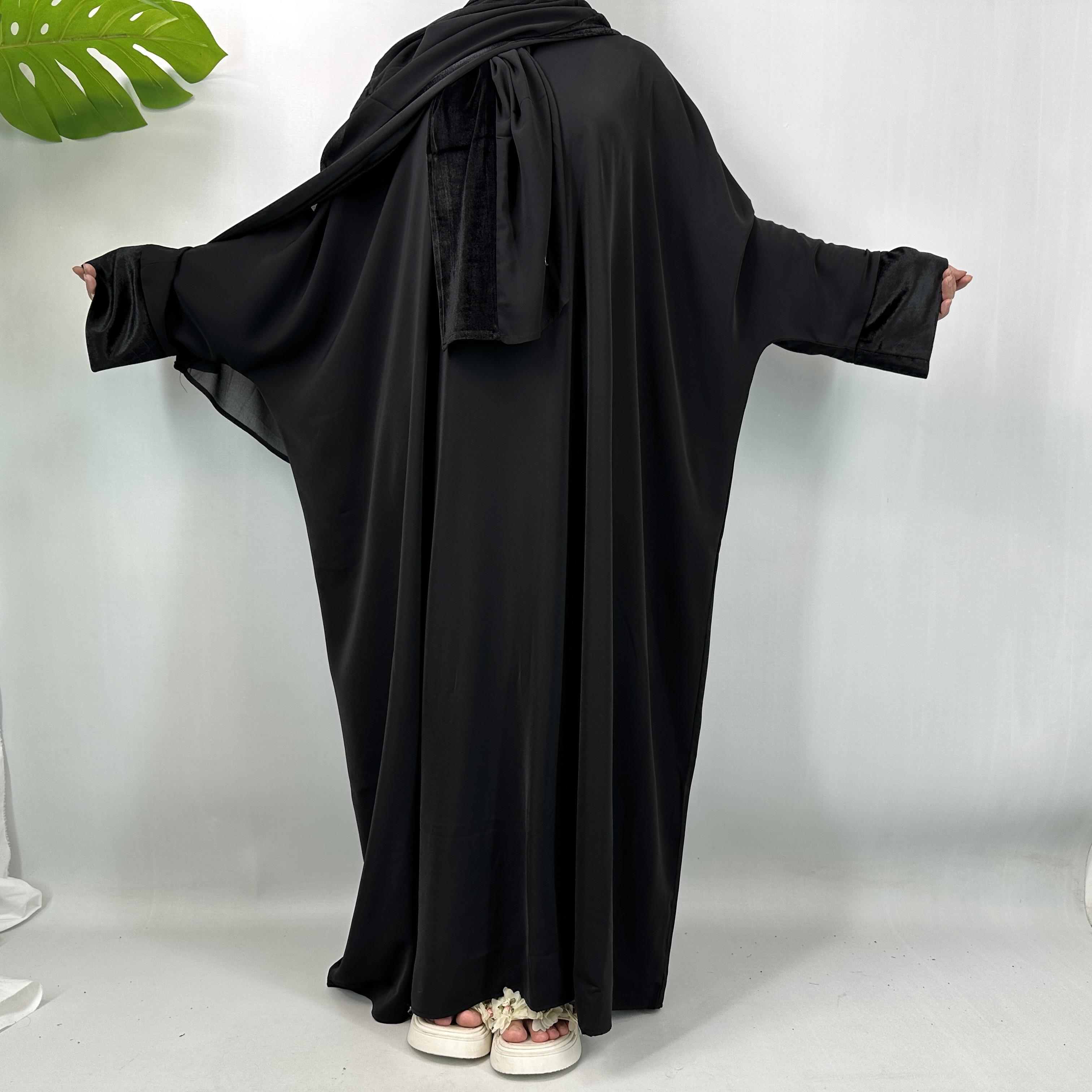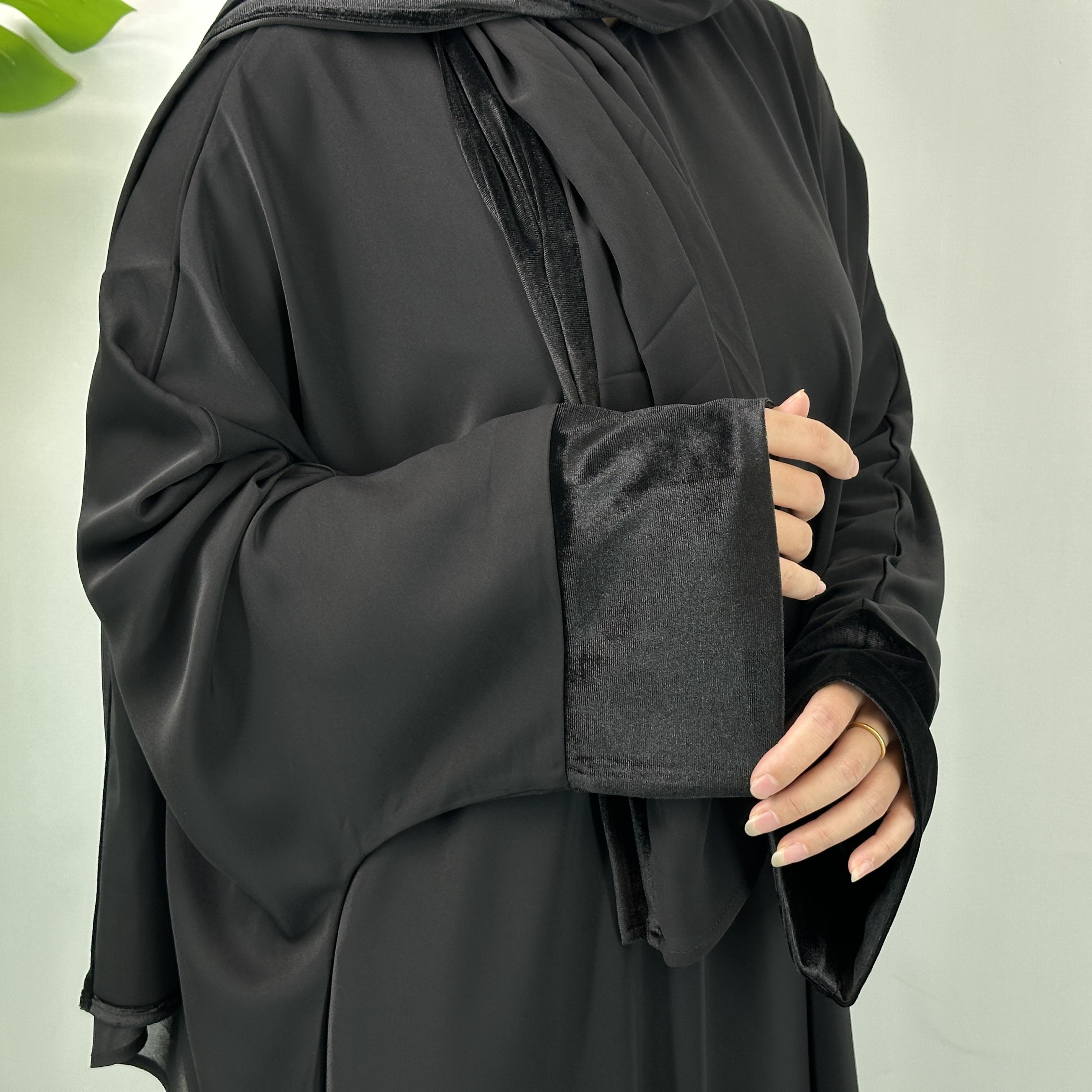 This dress set is versatile, suitable for both casual and formal events. The batwing sleeves provide a comfortable fit, while the velvet detailing adds a premium touch. The set is designed to be warm, making it an excellent choice for cooler days. Elevate your wardrobe with this modest yet luxurious dress.