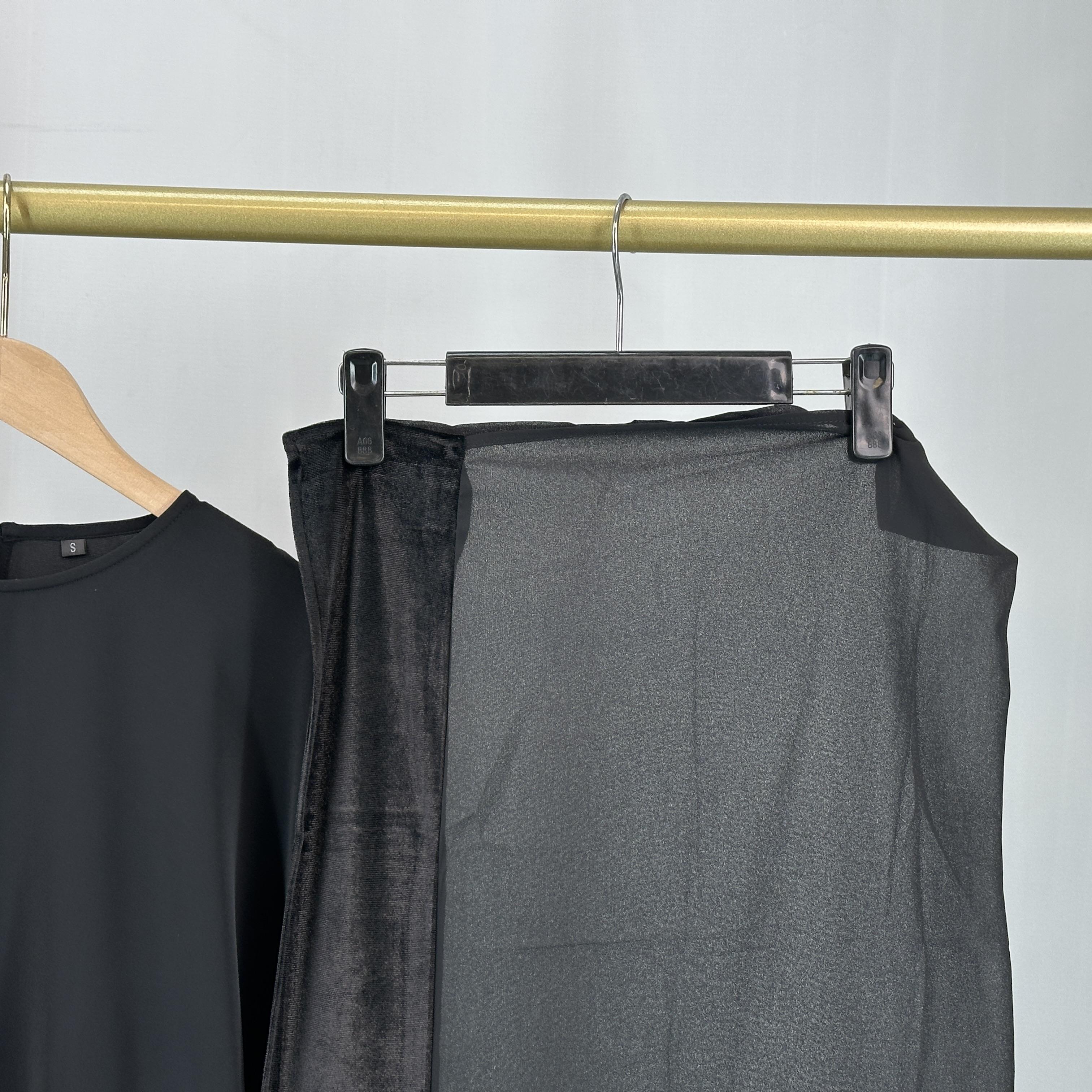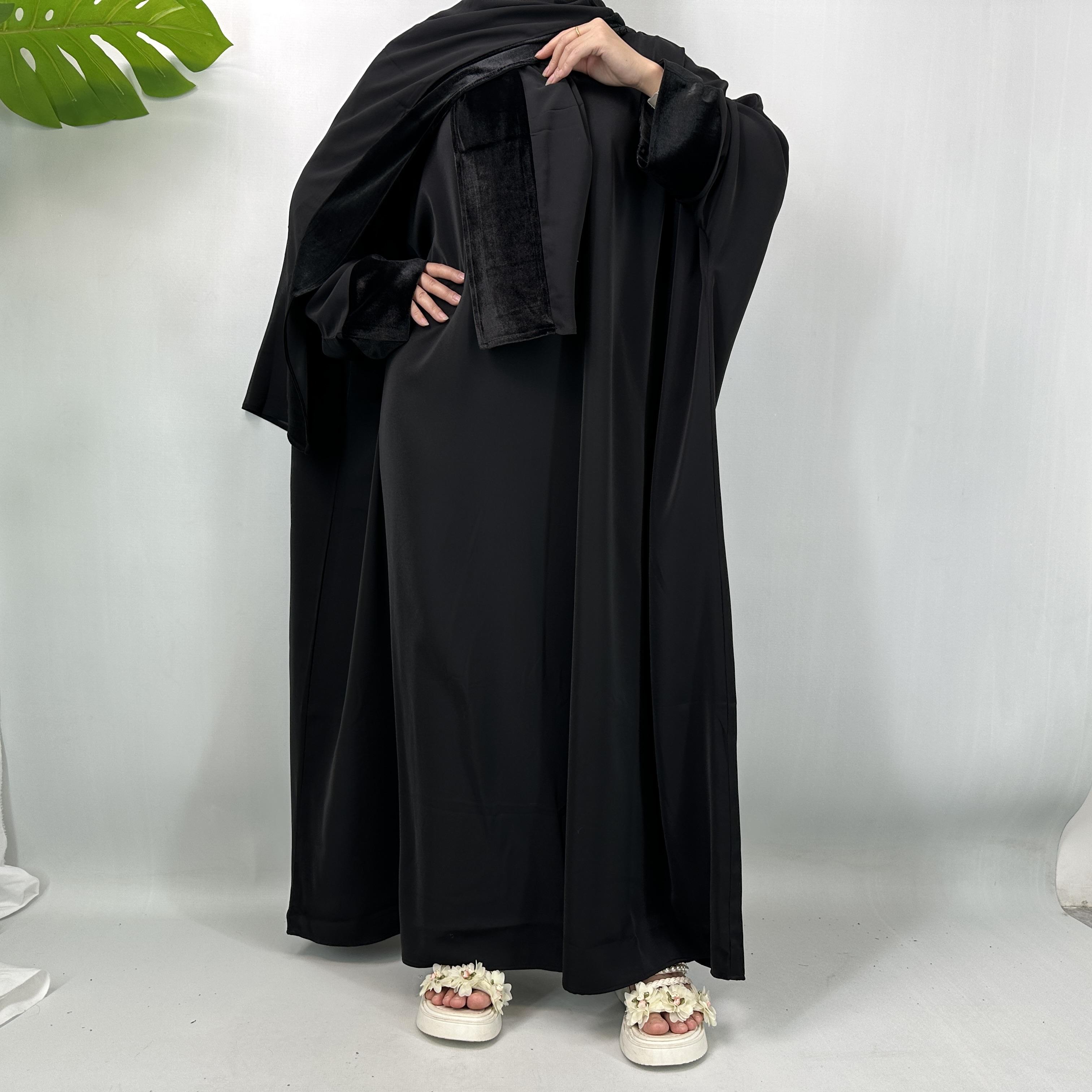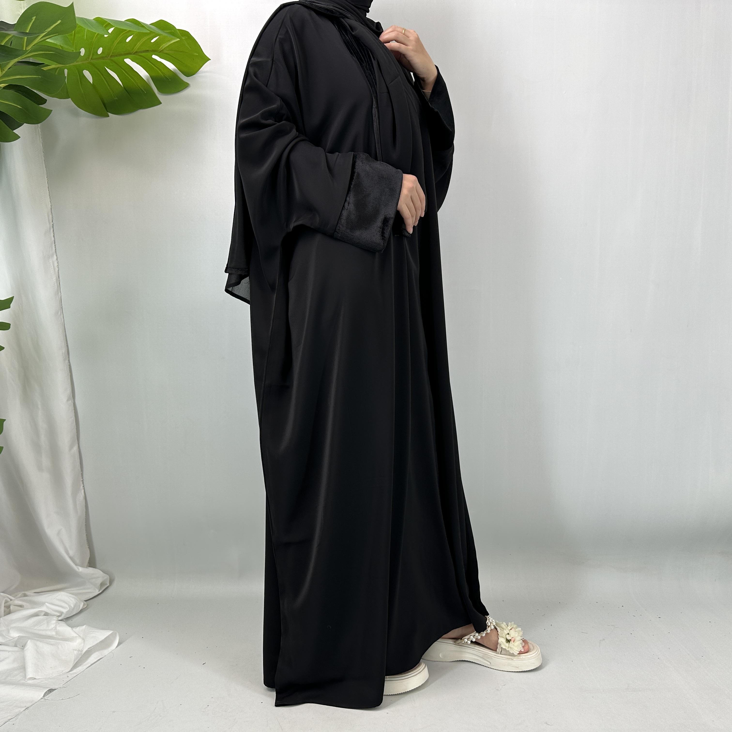 This dress set is versatile, suitable for both casual and formal events. The batwing sleeves provide a comfortable fit, while the velvet detailing adds a premium touch. The set is designed to be warm, making it an excellent choice for cooler days. Elevate your wardrobe with this modest yet luxurious dress.