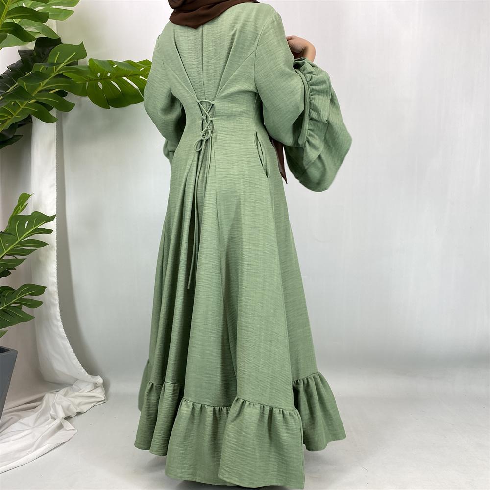 6896# Ramadan Muslim Maxi Dress with Pockets Side Pleated Design Elegant Loose Fit Long Sleeve Islamic Abaya for Women All Seasons