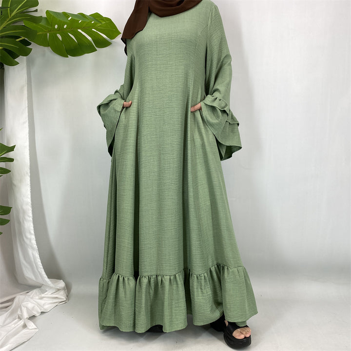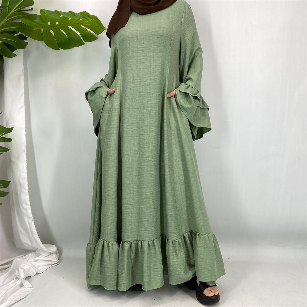 6896# Ramadan Muslim Maxi Dress with Pockets Side Pleated Design Elegant Loose Fit Long Sleeve Islamic Abaya for Women All Seasons