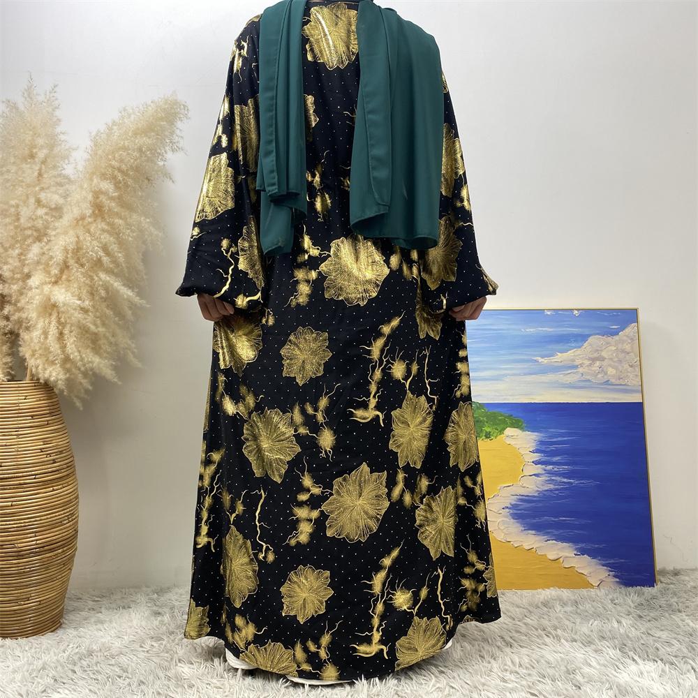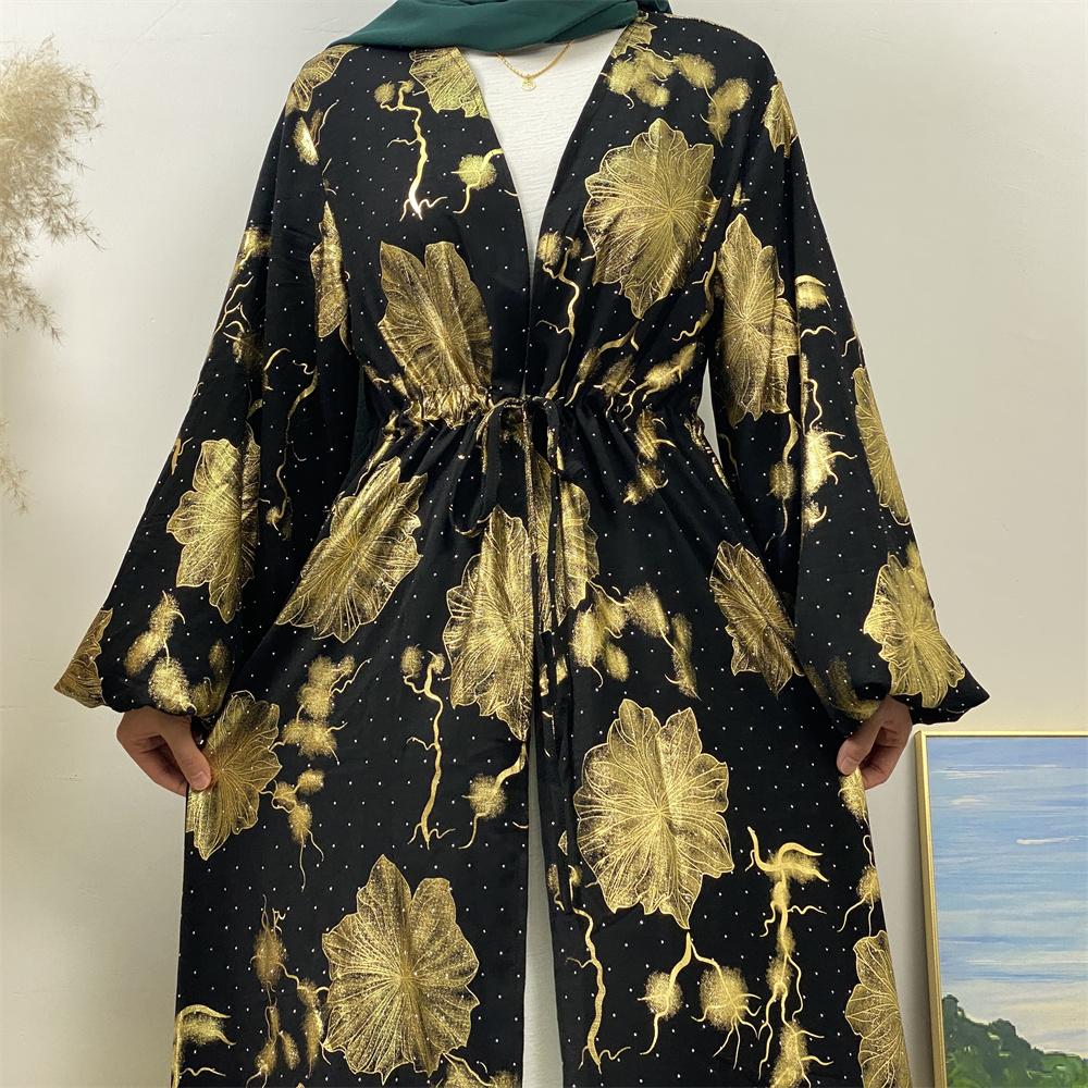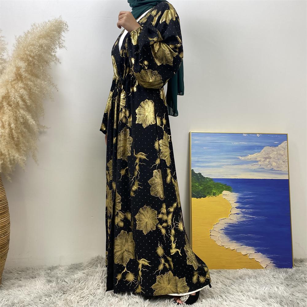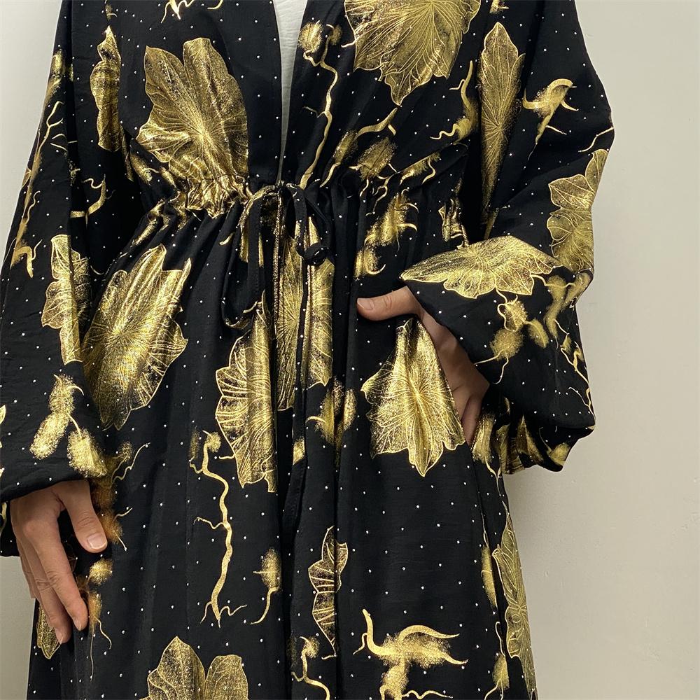 1444# Classy Gorgeously Gold Flowers Print With Shiny Rhinestones With Hidden Belt With Pockets Women Eid Black Abaya