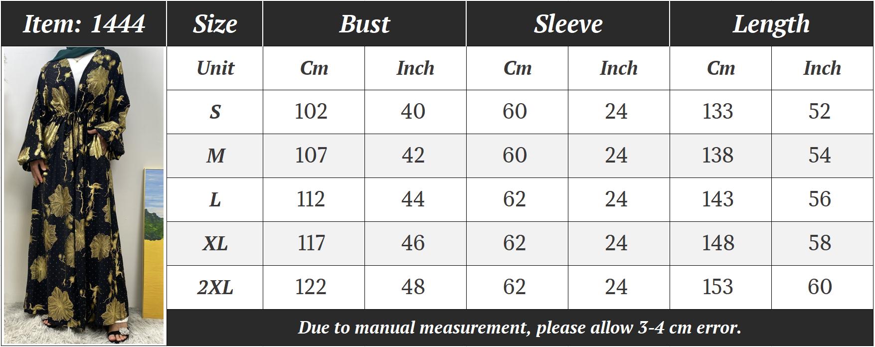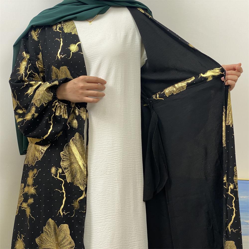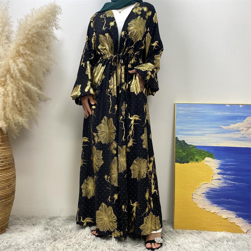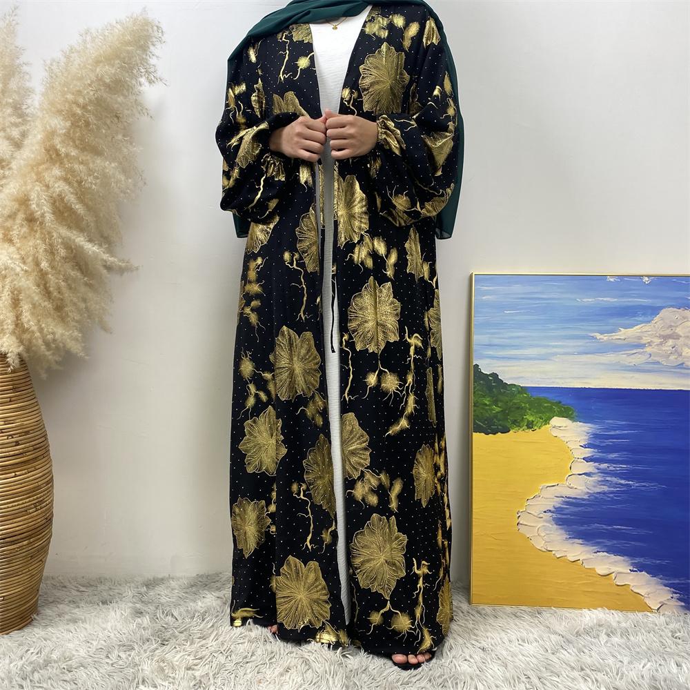 1444# Classy Gorgeously Gold Flowers Print With Shiny Rhinestones With Hidden Belt With Pockets Women Eid Black Abaya
