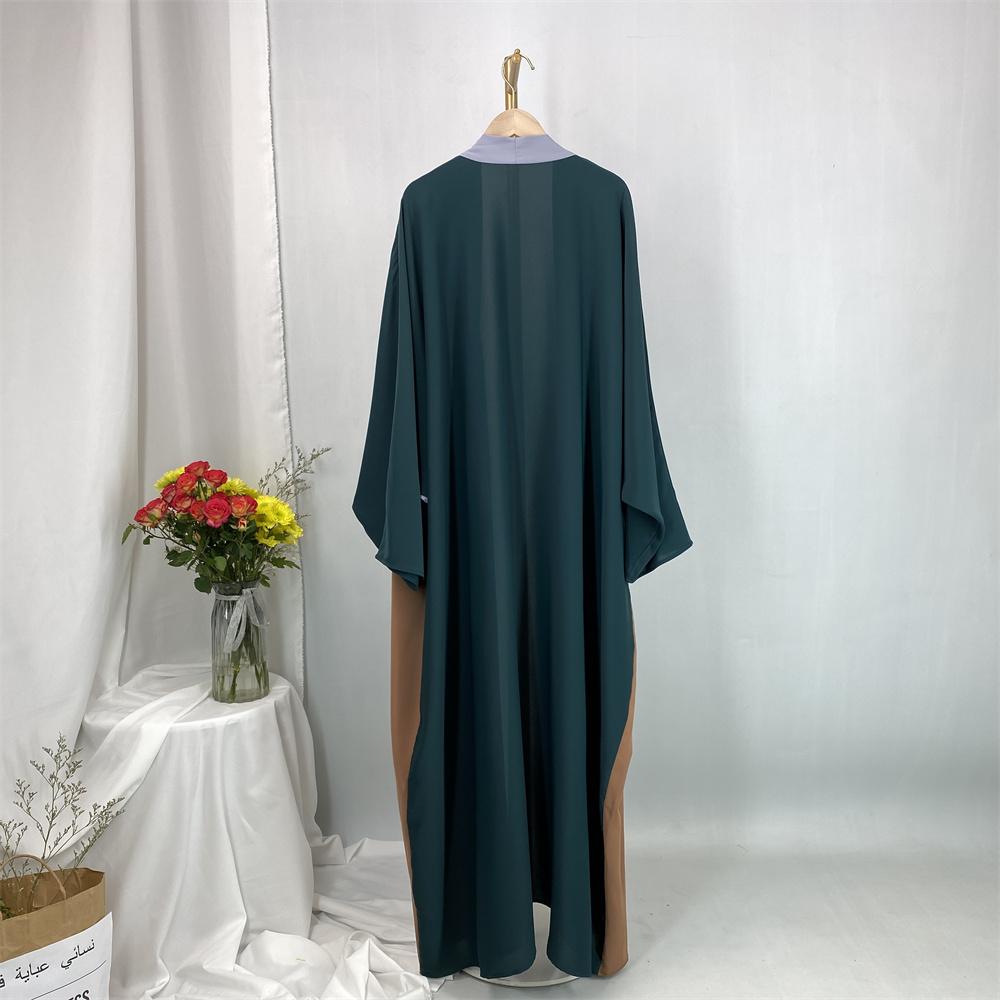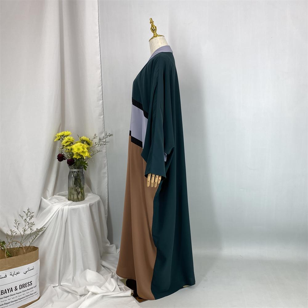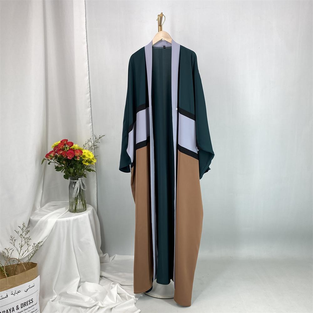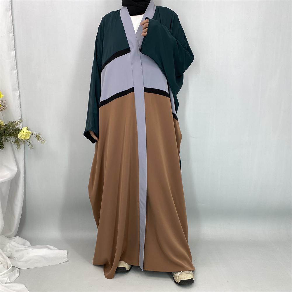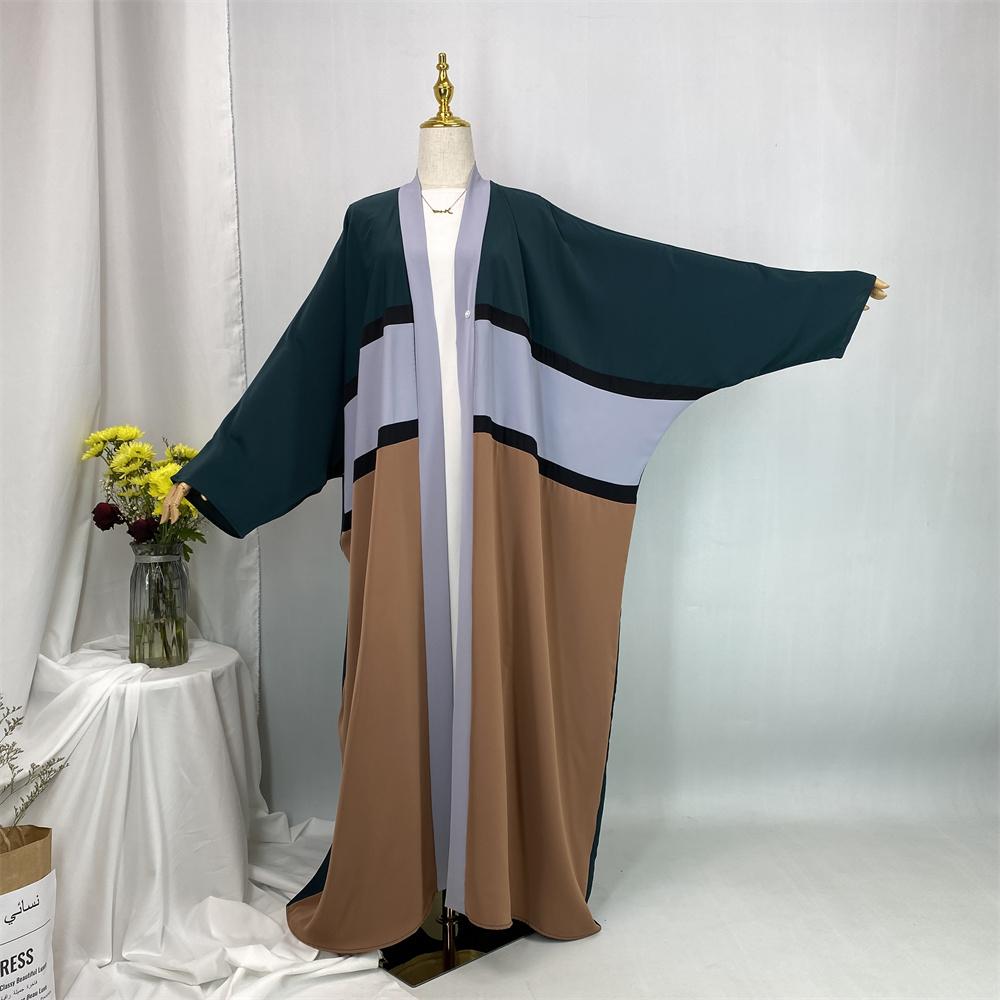 1459# 2025 Latest Muslim Open Abaya Robe Dubai Islamic Wholesale Bat Sleeve Patchwork Color Nida With Button for Women Ramadan