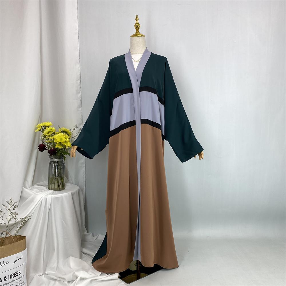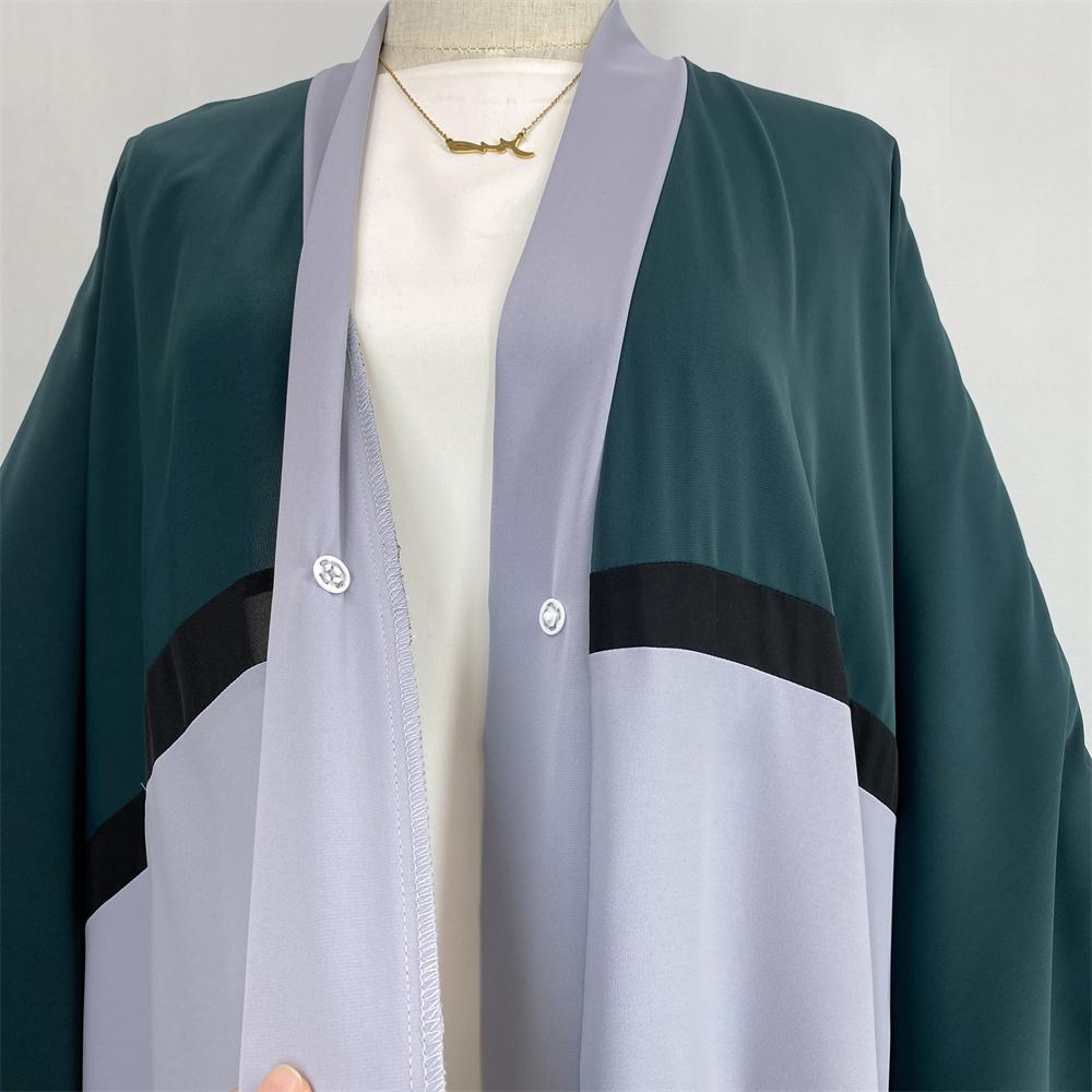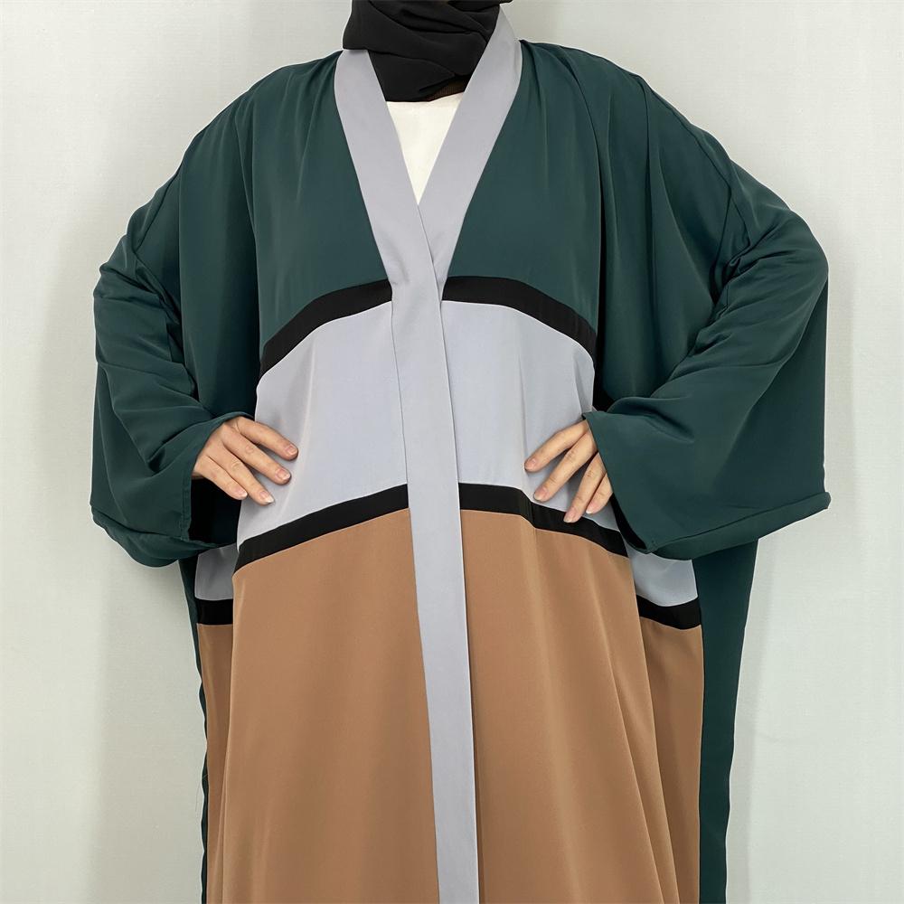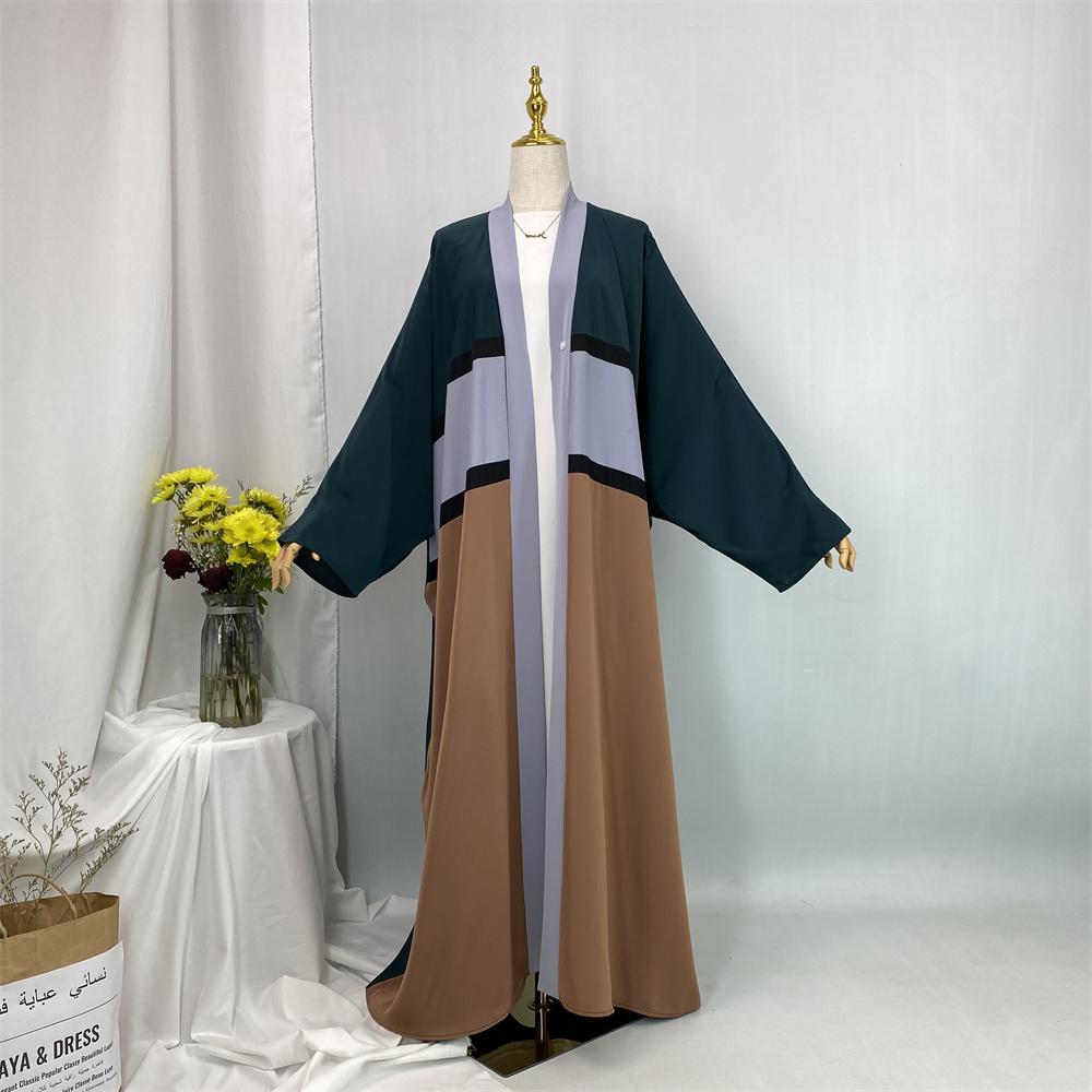 1459# 2025 Latest Muslim Open Abaya Robe Dubai Islamic Wholesale Bat Sleeve Patchwork Color Nida With Button for Women Ramadan