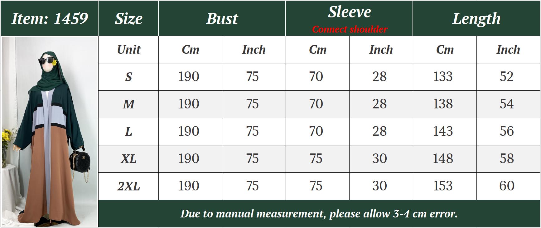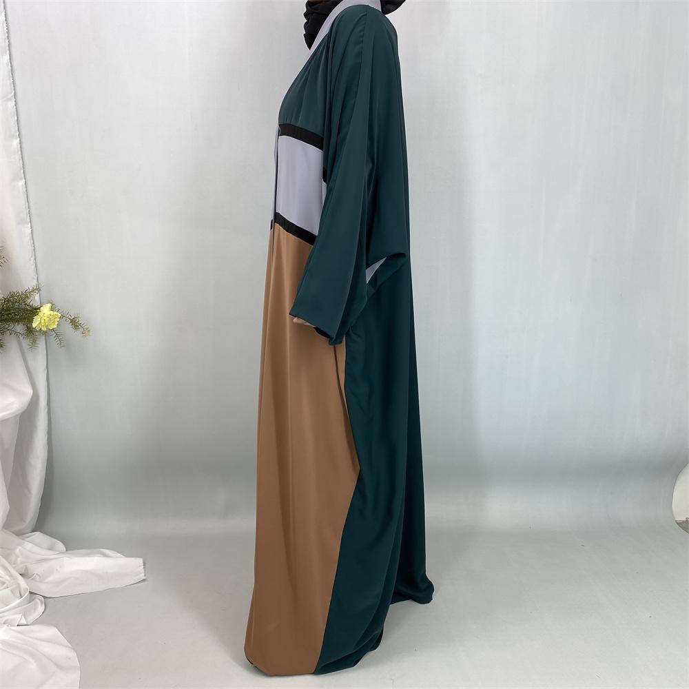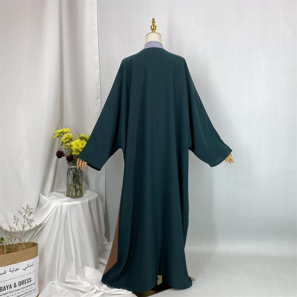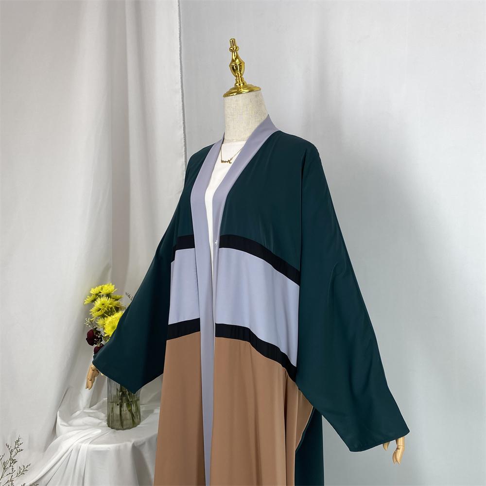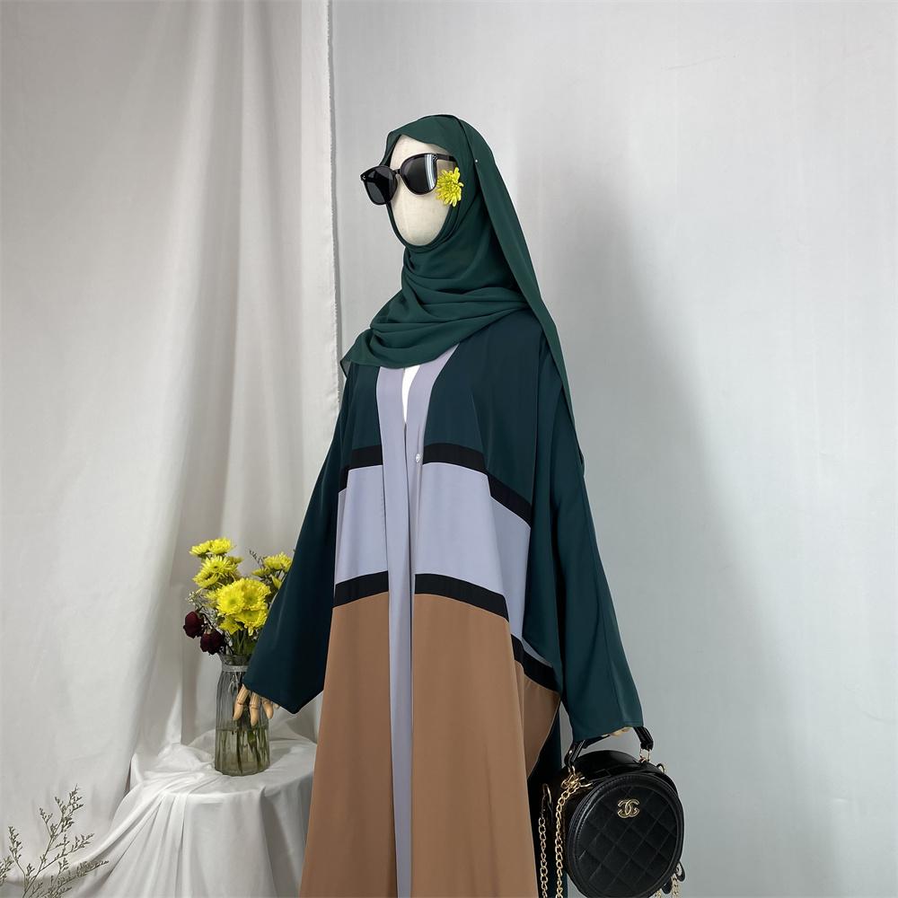 1459# 2025 Latest Muslim Open Abaya Robe Dubai Islamic Wholesale Bat Sleeve Patchwork Color Nida With Button for Women Ramadan